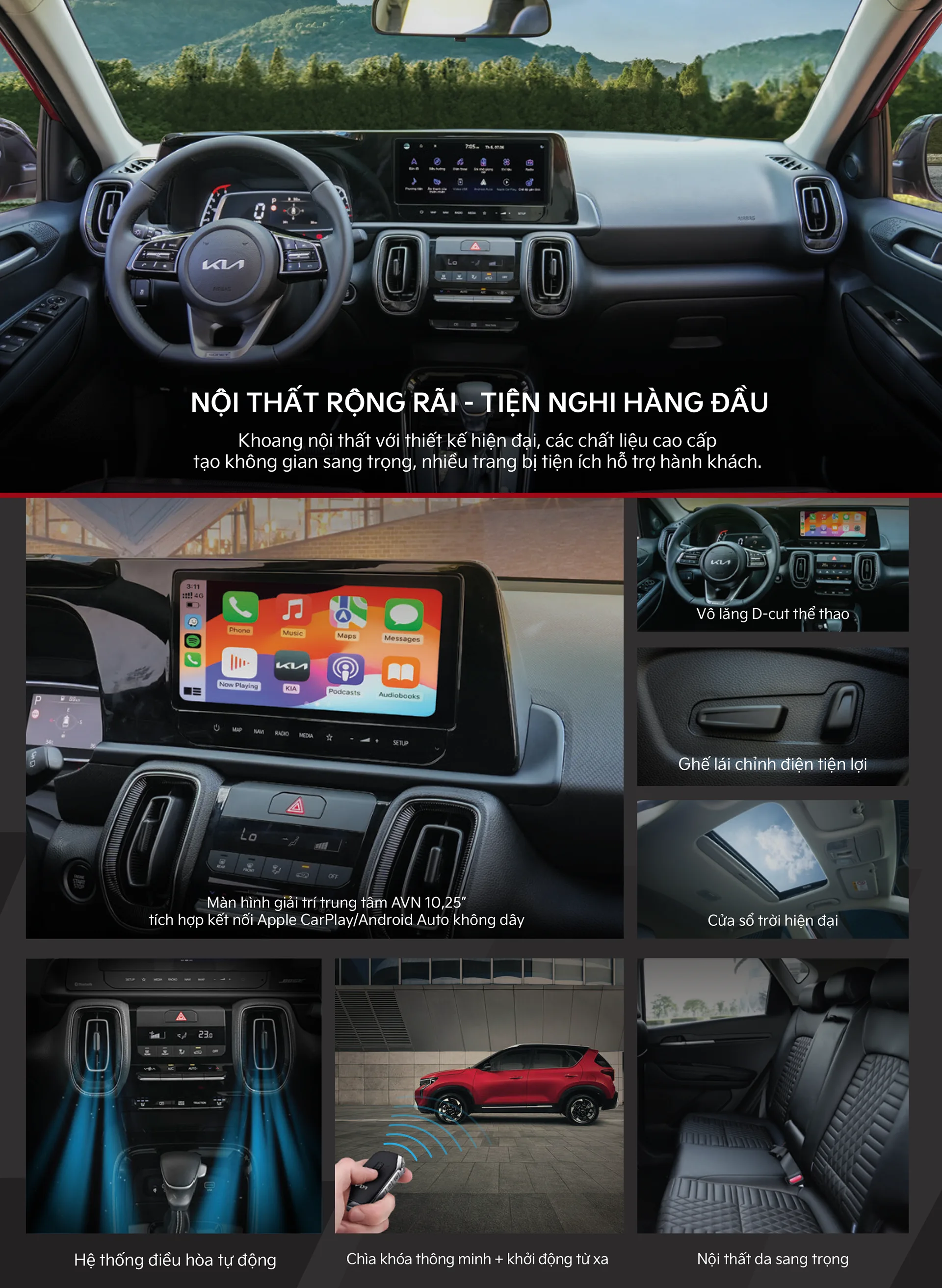 Kia New Sonet được trang bị khởi động xe từ xa thông qua chìa khóa điện tử thông minh “Smart key”, khởi động xe và hệ thống điều hòa từ xa trước khi sử dụng. Ngoài ra, mẫu xe còn trang bị hàng loạt các tiện nghi cao cấp khác như: cửa sổ trời chỉnh điện và chống kẹp an toàn; cổng điện 12V, kết nối USB và cổng sạc type-C tiện dụng; khay để mắt kính thuận tiện; đèn chiếu sáng tách biệt cho khoang lái…