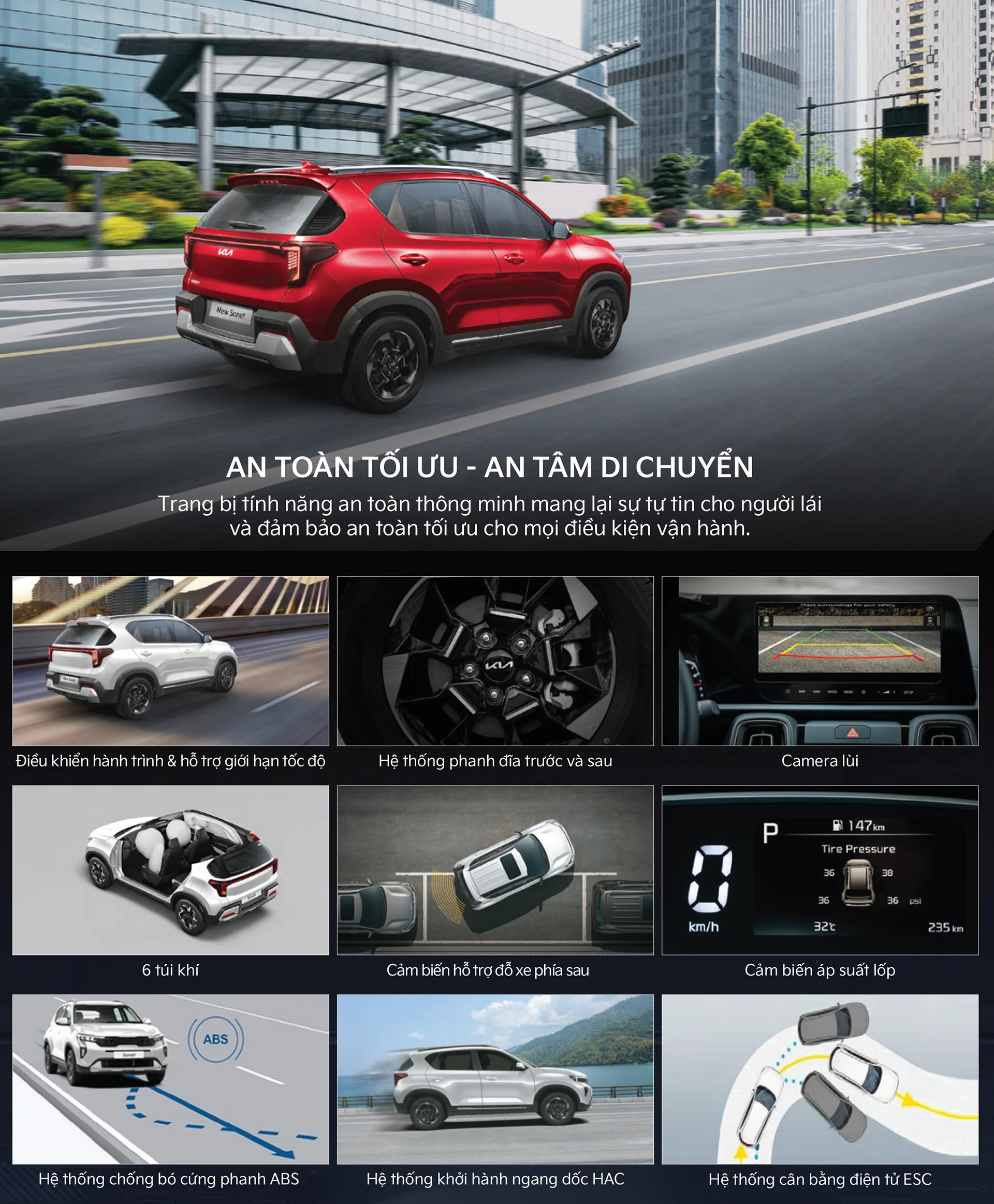 Bên cạnh đó, mẫu xe vẫn được trang bị đầy đủ các hệ thống hỗ trợ an toàn hiện đại như: 6 túi khí, hệ thống chống bó cứng phanh (ABS), hệ thống phân phối lực phanh điện tử (EBD), hệ thống cân bằng điện tử (ESC), hệ thống hỗ trợ khởi hành ngang dốc (HAC), và tính năng cảm biến áp suất lốp giúp khách hàng an tâm hơn khi sử dụng xe, bởi hệ thống sẽ hỗ trợ giám sát áp suất ở từng lốp xe; qua đó kịp thời phát hiện và nhanh chóng nhắc nhở người dùng khi phát hiện các bất thường trong quá trình di chuyển.