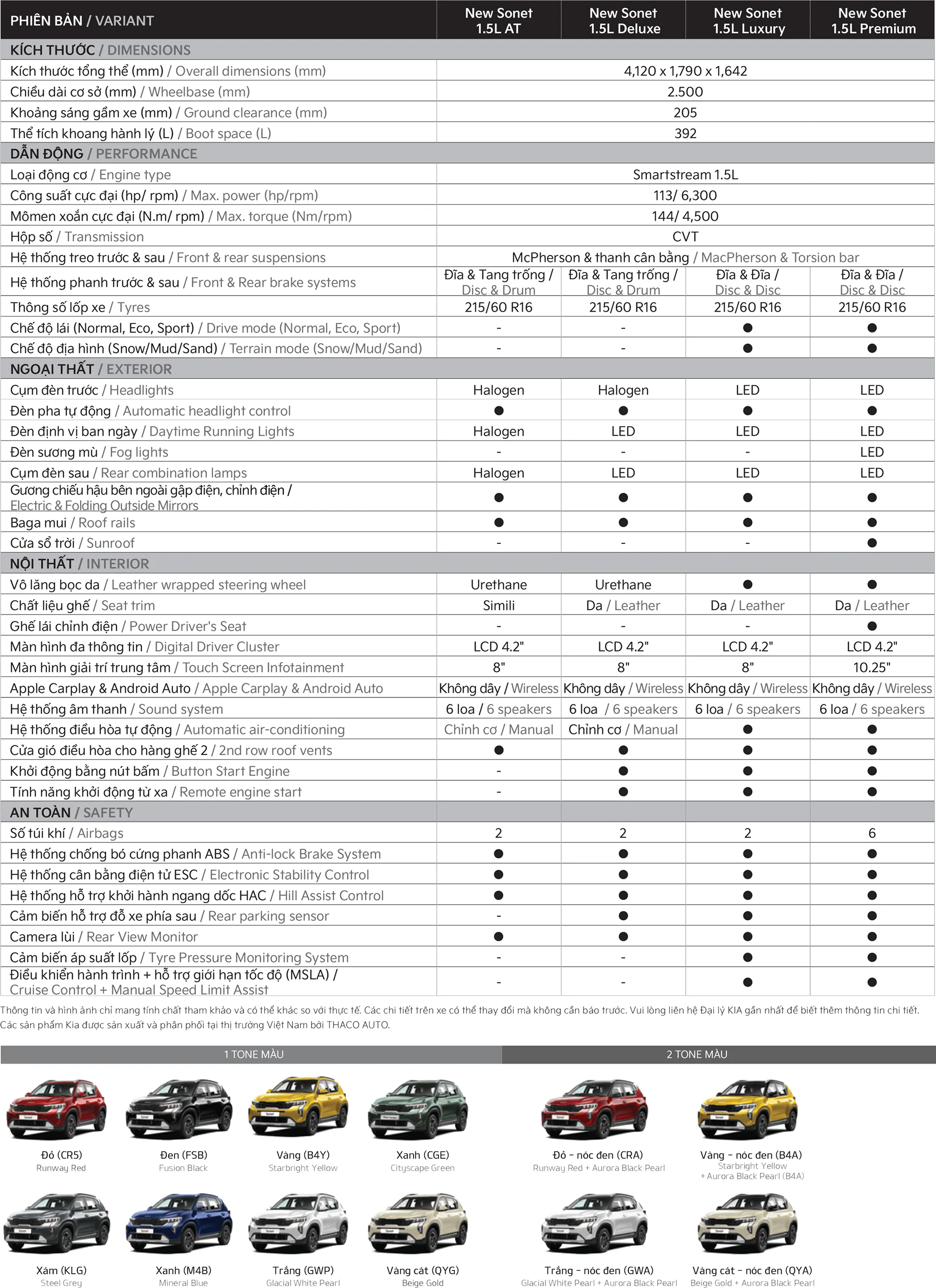 Tại Việt Nam, thương hiệu Kia do THACO AUTO phân phối luôn mang đến cho khách hàng sự lựa chọn đa dạng. Kia New Sonet được phân phối với 4 phiên bản AT Tiêu chuẩn, Deluxe, Luxury và Premium cùng 8 tùy chọn màu sơn ngoại thất và 4 tùy chọn màu 2 tone.