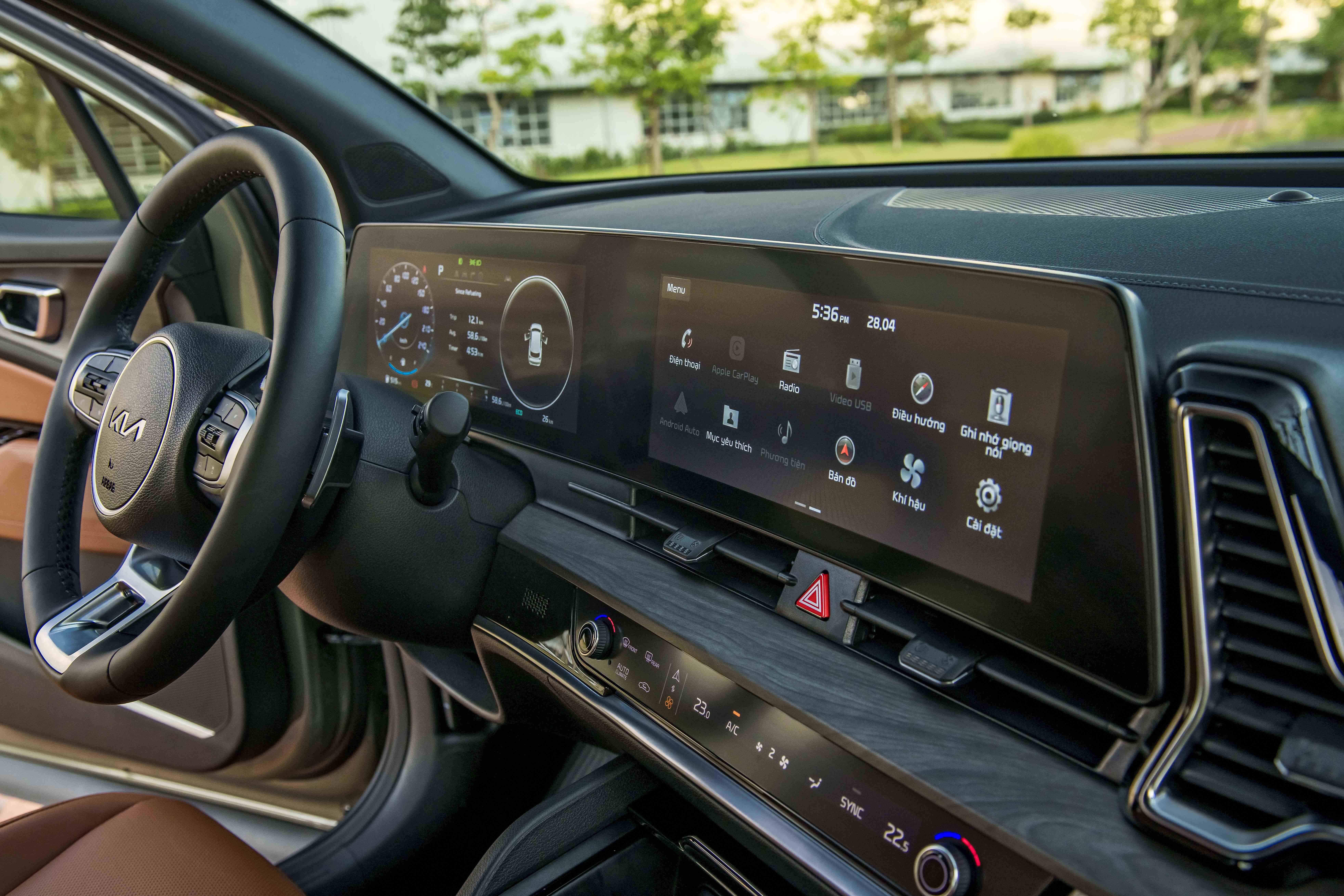 Khu vực ghế trước của Kia Sportage được trang bị màn hình phía sau vô-lăng và màn hình giải trí nối liền thành một dải màn hình cong cỡ lớn. Đối với phiên bản cao cấp nhất, mỗi màn hình có kích thước lên đến 12,3 inch.